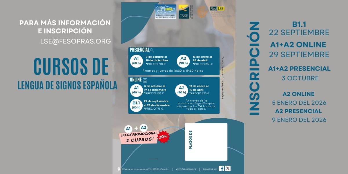 Incluye niveles A1, A2 y B1.1, tanto en modalidad presencial en el local de Oviedo, como en modalidad online a través de la plataforma SignoCampus.