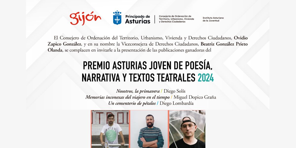 El miércoles 9 de julio, en la carpa del Encuentro dentro de los actos de la Semana Negra de Xixón 2025 (antiguos astilleros de Naval Gijón), a las 20:00 horas, tendrá lugar la entrega de los Premios Asturias Joven de Poesía, Narrativa y Textos Teatrales correspondientes al programa Culturaquí 2024 del Instituto Asturiano de la Juventud. Un programa concebido para ofrecer a la juventud asturiana la posibilidad de hallar un cauce en el que tengan cabida disciplinas artísticas heterogéneas y desde el que la juventud creadora disponga de la oportunidad de alcanzar el reconocimiento del público en general y de los diferentes medios especializados.