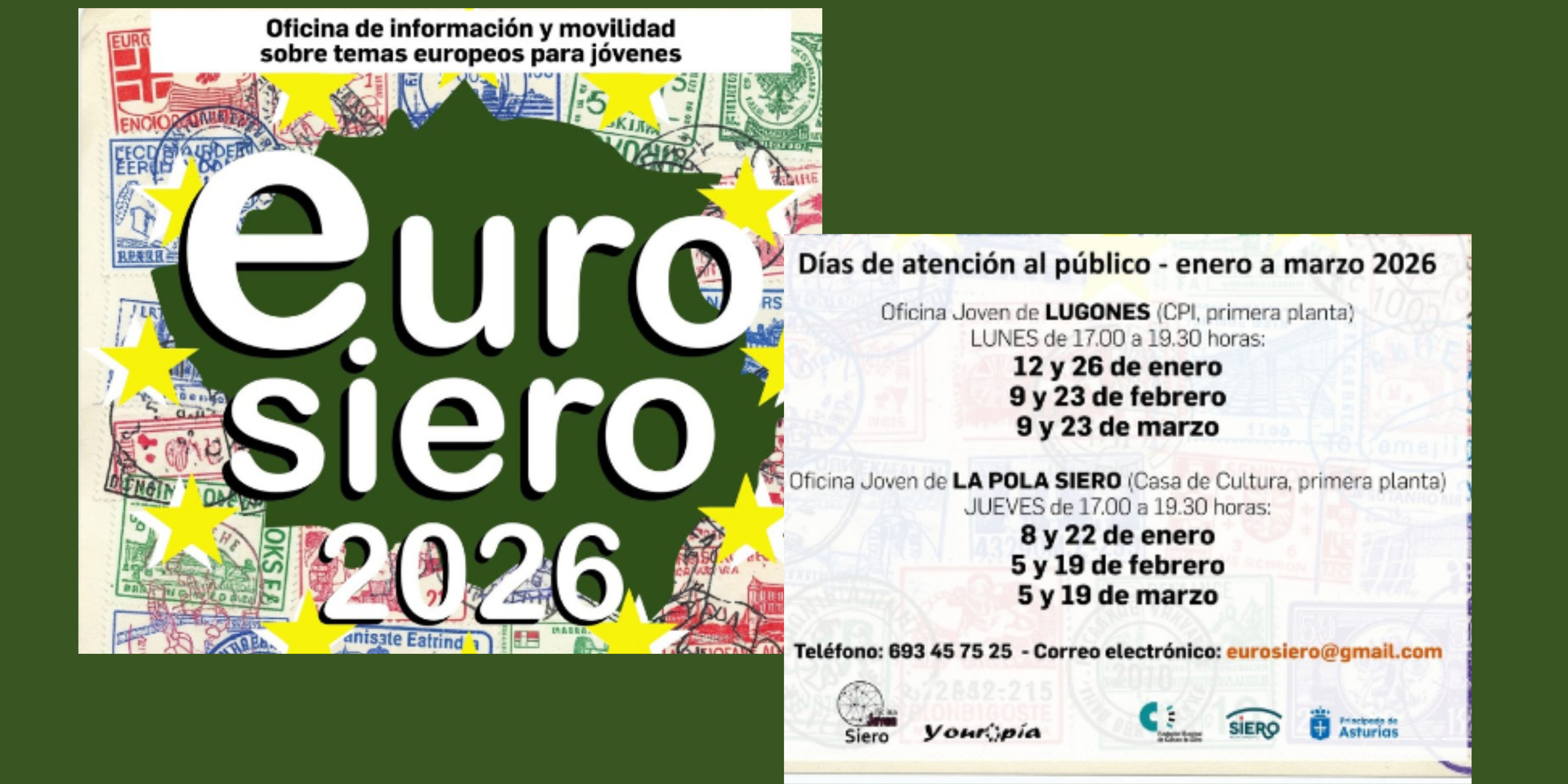 La Oficina Joven de Siero publica el calendario de apertura al público del primer trimestre de 2026 de EUROSIERO, oficina informativa en la que se atenderán las consultas sobre los distintos programas y servicios que la Unión Europa pone a disposición de su población juvenil en diferentes ámbitos: