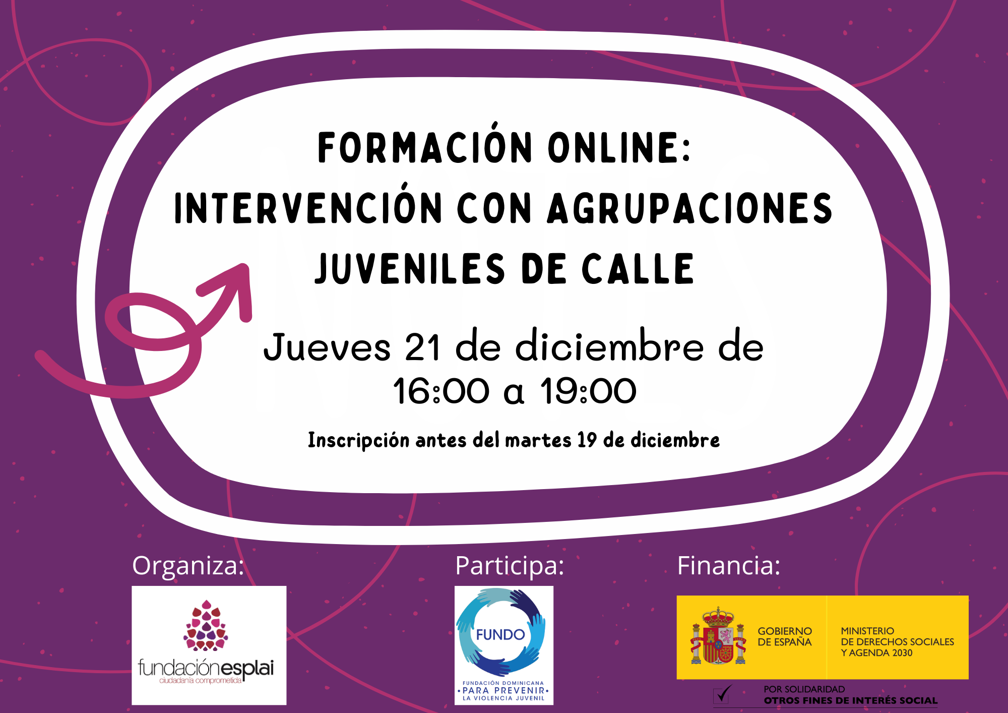 Todo lo que rodea a las agrupaciones juveniles de calle está completamente inundado de mitos y prejuicios que contribuyen a una imagen sesgada de determinados colectivos, pudiendo esto influir en la intervención social que se realiza en diversos ámbitos. Es por ello que el jueves 21, junto a la Fundación Dominicana (FUNDO), se realizará de 16:00 a 19:00 una formación online sobre intervención con personas pertenecientes a agrupaciones juveniles de calle dirigida a estudiantes y profesionales del ámbito social que permita generar una visión más realista de esta situación, así como estrategias adecuadas de intervención.