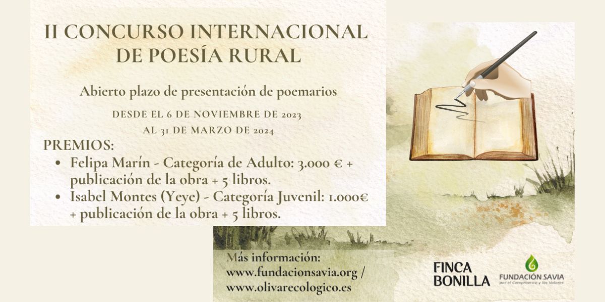 La Fundación Savia y Finca Ecológica Bonilla convocan el II Premio Internacional de Poesía RURAL en lengua castellana, abierto a autores de cualquier nacionalidad. El deseo es potenciar la creación poética con temática relacionada con la despoblación, el cambio climático, la naturaleza y el paisaje rural.