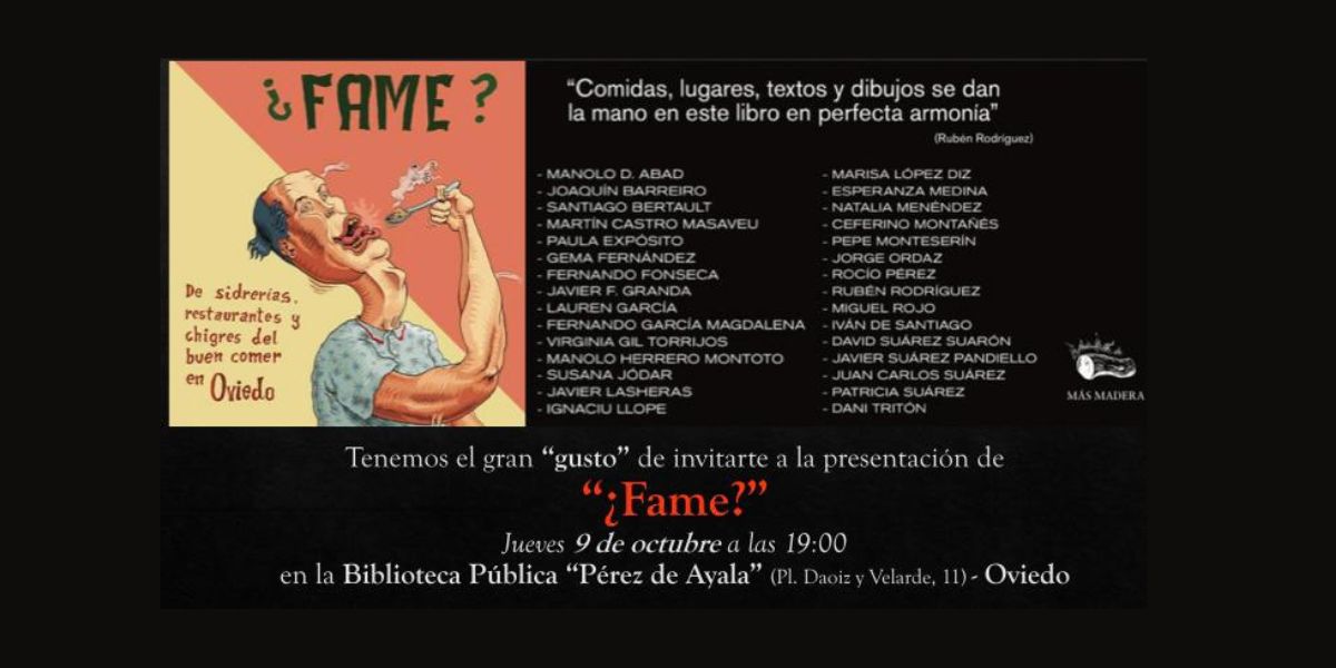 Desde el Hotel de Asociaciones Santullano nos invitan a la presentación del libro "¿Fame?" que se celebrará el próximo día 9 de octubre, a las 19:00 horas, en el salón de actos de la Biblioteca de Asturias Pérez de Ayala (Fontán) de OVIEDO.