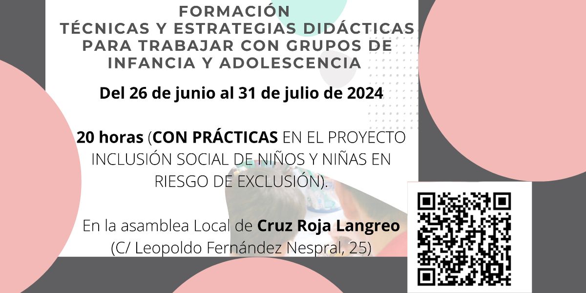 IMPORTANTE: las prácticas se realizarán en el proyecto de Inclusión Social de niños y niñas en riesgo de exclusión, hasta el 31 de julio, en un horario a convenir con el proyecto. Si alguien tiene alguna duda sobre la disponibilidad que necesita puede escribir a langreo-infancia@cruzroja.es que contestarán en el menor tiempo posible. Si no se realizasen las prácticas en ese periodo de tiempo se perderá el derecho a la certificación.